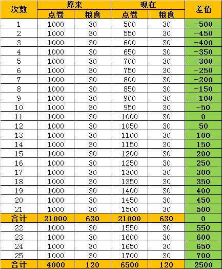 原來點卷換糧食的比例為1:30,現(xiàn)在剛開始為500點卷換取30W糧食,每換一次,點卷增加50。
