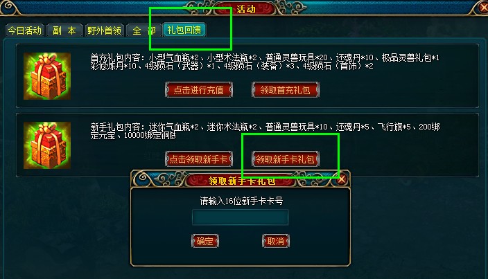 4、進入游戲,點擊游戲界面右上方的“活動”,選擇“禮包回饋”,點擊“領取新手卡禮包”彈出新手卡號輸入框,