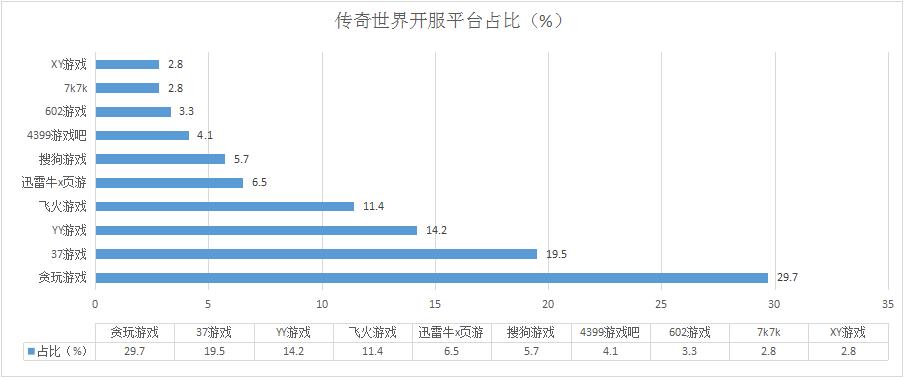 《傳奇世界》本周開服總數(shù)同樣有所增漲,其在貪玩游戲的開服占比回升至近三成,開服頻率達(dá)到了10服/天。新增分布占比平臺XY游戲。
