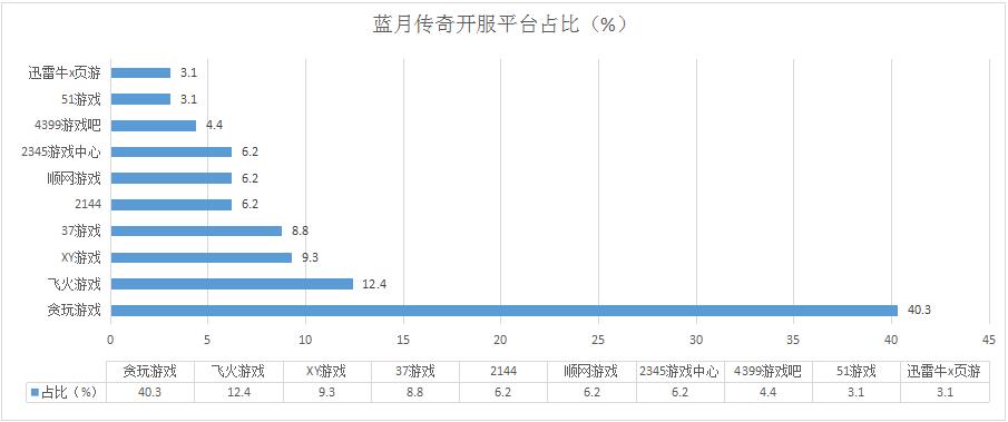《藍(lán)月傳奇》本周開服保持穩(wěn)定,其在各平臺(tái)分布占比情況基本未發(fā)生變化,新增分布占比平臺(tái)迅雷牛X頁游。
