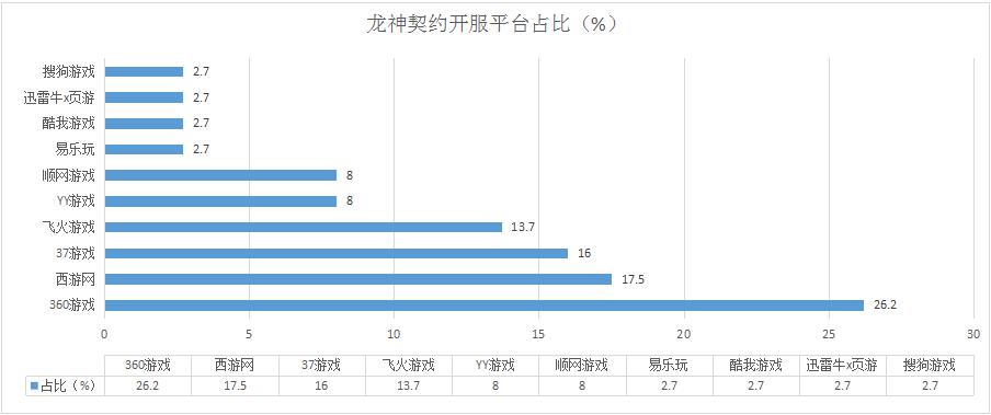 《龍神契約》本周開服總數(shù)較上周減少了10.7%,其在37游戲等多家平臺(tái)的開服頻率下調(diào)或成主因。新增分布占比平臺(tái)易樂玩、酷我游戲,開服頻率1服/天。