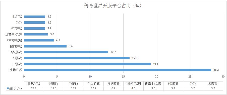 本周《傳奇世界》開服總數(shù)較上周略有減少,但整體開服形勢仍較為穩(wěn)定,其在各平臺(tái)分布占比情況基本未發(fā)生變化。