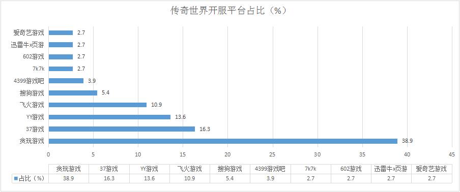 本周《傳奇世界》開服總數(shù)較上周增漲了13.8%,主要得益于其在貪玩游戲的開服頻率有所回升;新增分布占比平臺7K7K、迅雷牛X頁游。