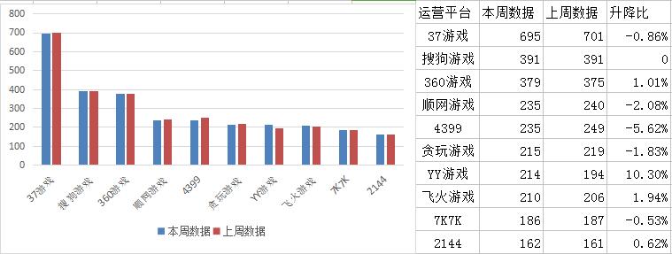 本周運(yùn)營(yíng)平臺(tái)開(kāi)服排行前三:37游戲、搜狗游戲、360游戲;本周上榜平臺(tái)共計(jì)開(kāi)服2922組,占一線平臺(tái)開(kāi)服總數(shù)58.3%;其中開(kāi)服前三平臺(tái)共開(kāi)服1465組,占榜單開(kāi)服總數(shù)50.1%,該占比較上周縮減0.5%。