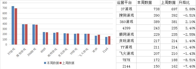 本周運營平臺開服排行前三:37游戲、搜狗游戲、360游戲;本周上榜平臺共計開服2946組,占一線平臺開服總數(shù)59.3%,該占比較上周增漲1%;其中開服前三平臺共開服1517組,占榜單開服總數(shù)51.5%。