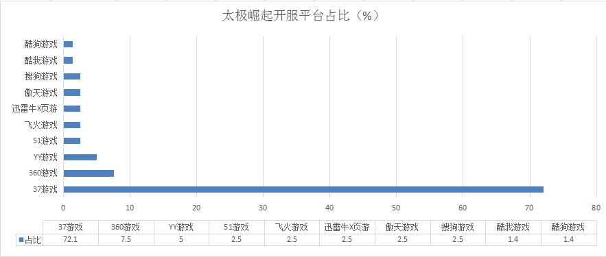 《太極崛起》本周開服總數(shù)大漲15.1%,其在37游戲的開服占比回升至72.1%,開服頻率峰值高達29服/天。