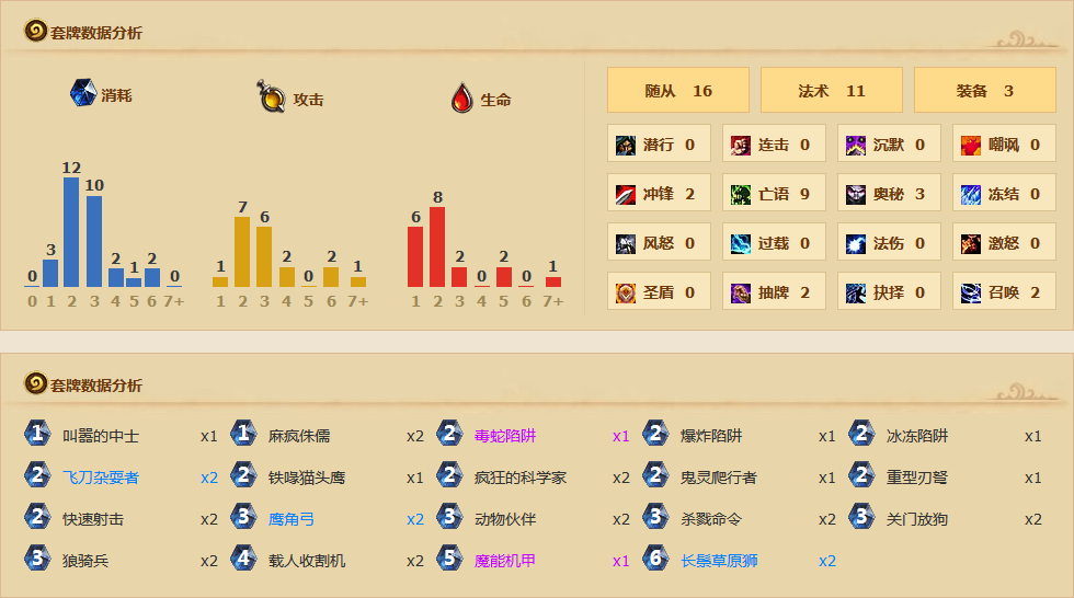 如我后手起手兩個(gè)閥木機(jī)或獅子,那我會(huì)打得像中速獵;如果起手都是小隨從,那給對(duì)方感覺又會(huì)是T7獵。三個(gè)陷阱各一張,根據(jù)陷阱的不同調(diào)整打法。重點(diǎn)在于要讓對(duì)手摸不透你的思維方式——變速獵比T7擁有更強(qiáng)的中期能力,又比中速獵擁有更強(qiáng)的搶血能力,節(jié)奏上來(lái)說處于兩者之間,可以說比較適合當(dāng)前環(huán)境,希望大家用得順利。