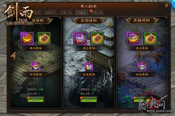 劍雨江湖靈羽進(jìn)階副本難度較低,是每個(gè)玩家都不能錯(cuò)過的日常副本。玩家達(dá)到70級(jí)之后可以參與靈羽進(jìn)階副本。進(jìn)入副本后,擊殺地圖內(nèi)所有怪物與BOSS即為通關(guān)。擊殺BOSS與通關(guān)均有道具獎(jiǎng)勵(lì)。玩家每天可以免費(fèi)通關(guān)一次副本,如果想再次進(jìn)入則需要消耗一定量的元寶重置進(jìn)入次數(shù)。