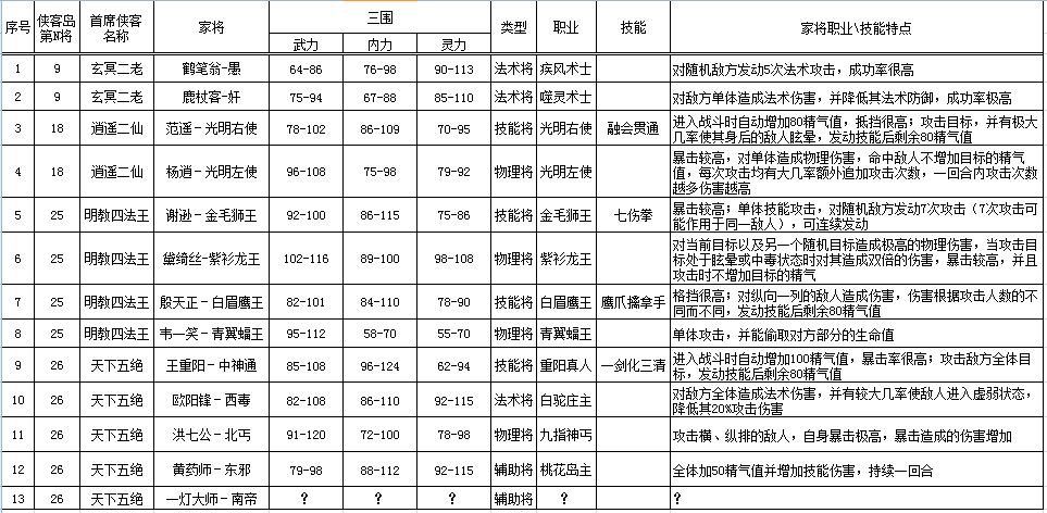 前段時間一直有玩家說俠客島能招這個能招那個的,現(xiàn)在我來做個收集表格,從上面的表格可以清楚的知道,俠客島一共可以招募13個家將,并且具體是打第幾個俠客島NPC。還有家將的三圍、職業(yè)、技能說明及類型,在表格中也分別指出了至此除了一燈大師的數(shù)據(jù)沒有出來其他12個家將已經(jīng)完善全部數(shù)據(jù)。