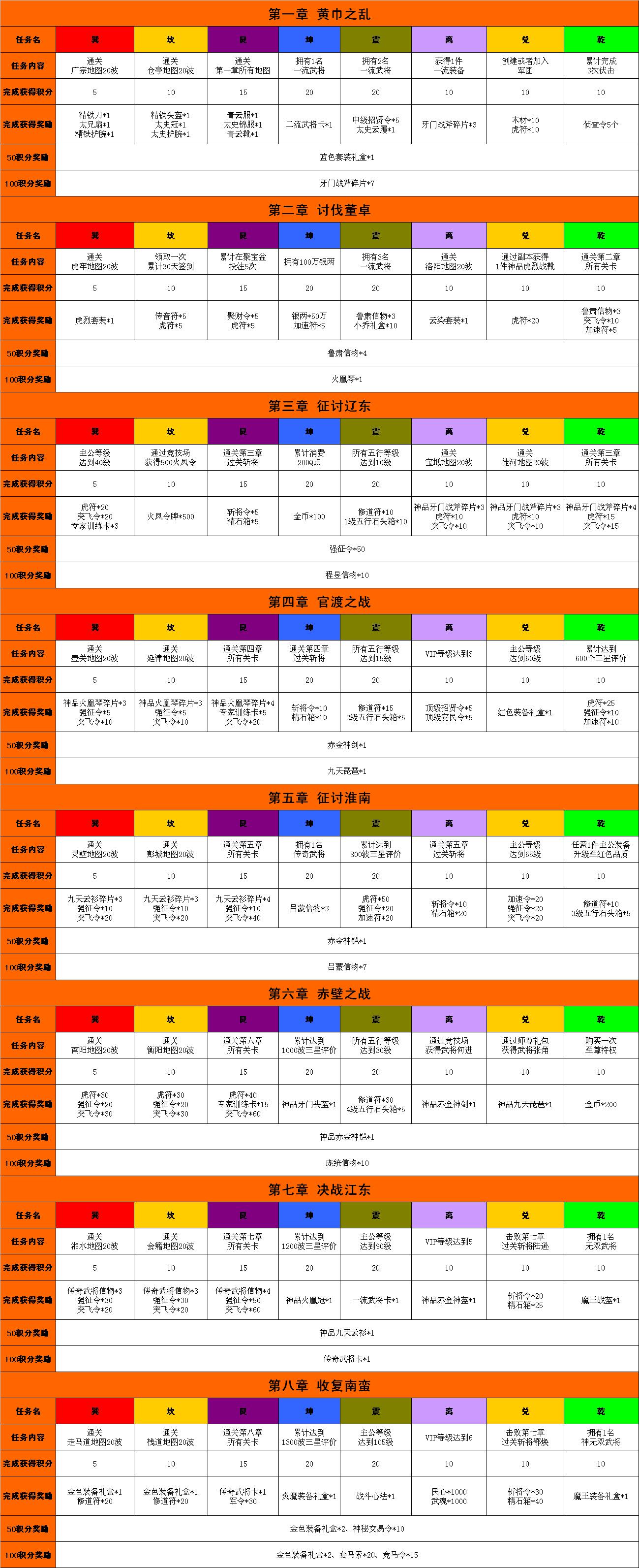 時間:2014-12-06 14:30:00 來源:玩家 作者:塔防三國志征戰(zhàn)三國是一項(xiàng)任務(wù)福利玩法,只要完成征戰(zhàn)三國章節(jié)目標(biāo)任務(wù),即可領(lǐng)取豐厚的獎勵。這里為大家分享1至8章的任務(wù)內(nèi)容及對應(yīng)獎勵。(點(diǎn)擊圖片并放大查看大圖)