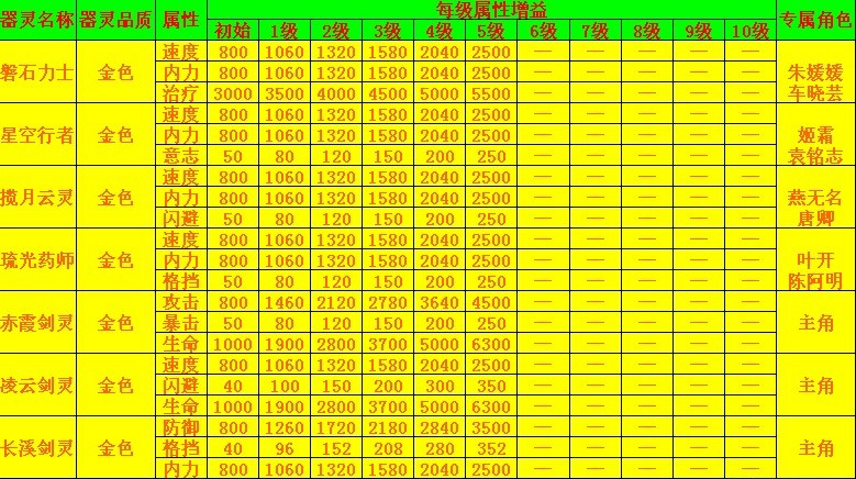 金色器靈1-5級(jí)屬性一覽:(數(shù)據(jù)殘缺,如有玩家能提供在論壇中給安曲或在玩家群中給激石皆可)
