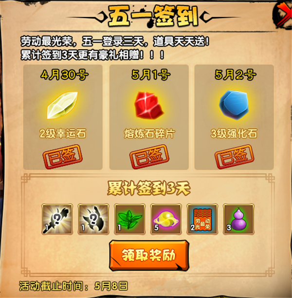 此圖標看起來不是很高大上,但絕對夠淳樸厚實,非常符合勞動節(jié)氣氛和節(jié)奏,點擊一看,為期三天的簽到