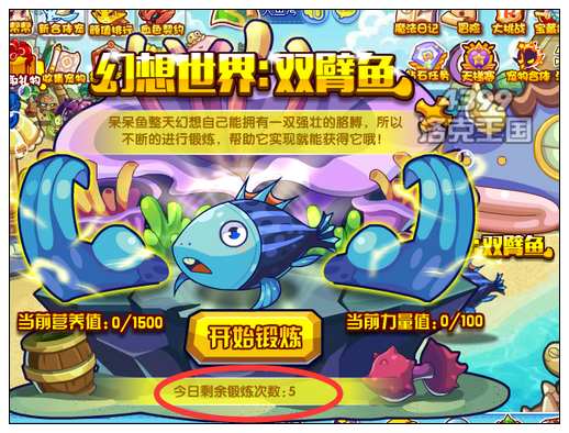 想要帶走雙臂魚需要營養(yǎng)值:1500,力量值:100;每天有5次鍛煉的機(jī)會。