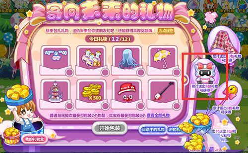 在活動中,打包禮物送給未來的自己或是好友吧。活動中累積送出8份禮物就可以領取獎勵禮物機器人裝了。