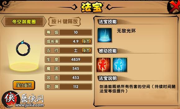 施展后發(fā)出一道光束,人物站在此光束內(nèi)呈無(wú)敵狀態(tài)(法寶升至滿級(jí)才持續(xù)5秒,若法寶屬性好,在7秒左右)而且出此光束,則無(wú)效化