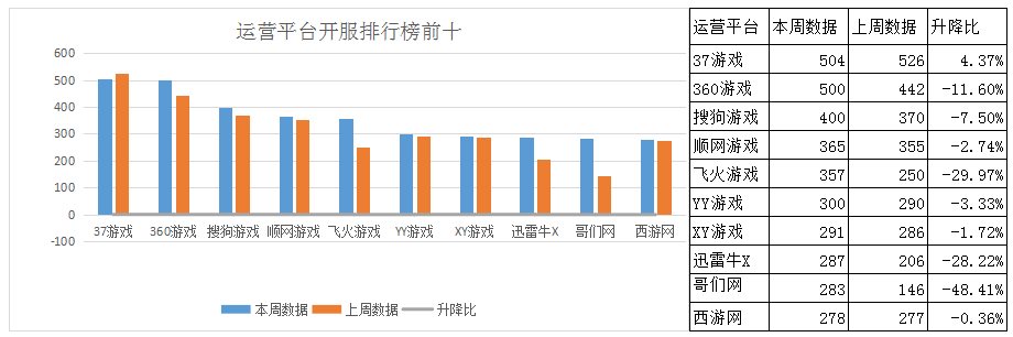 本周榜單平臺的游戲開服與上周相比變化較大,多個平臺開服皆呈現(xiàn)漲勢,競爭十分激烈。新游《范偉打天下》成績喜人,在360游戲、搜狗游戲、順網(wǎng)游戲、飛火游戲、迅雷牛X頁游、哥們網(wǎng)這六個平臺的開服占比同時登頂,看得出各平臺對這款游戲的重視,這也與其自身優(yōu)秀的游戲品質(zhì)密不可分。37游戲則維持著上周的開服策略,開服總數(shù)有所減少,以微弱優(yōu)勢占據(jù)榜首之位。