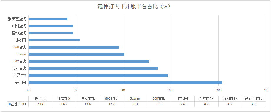 《范偉打天下》本周新游入榜,分布占比前三的平臺分別為:哥們網(wǎng)、迅雷牛X頁游、飛火游戲,開服占比分別為20.4%、14.7%和13.6%。