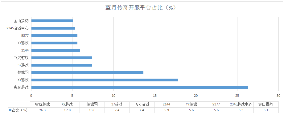 《藍月傳奇》本周開服總數(shù)較上周增長7.5%,新增分布占比平臺2345游戲中心、金山獵豹,開服占比分別為5.3%和5.1%。