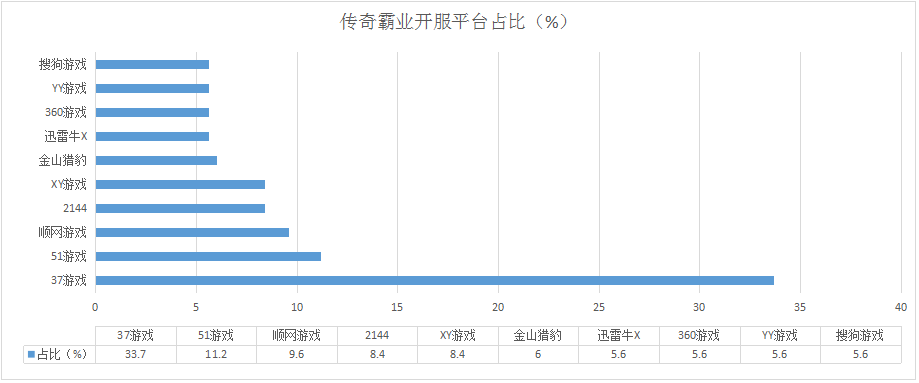 《傳奇霸業(yè)》本周開服總數(shù)比上周略有下降,37游戲開服最多,占比33.7%,其他多個平臺的開服占比均穩(wěn)定在5.6%。