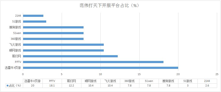 《范偉打天下》受整體市場(chǎng)影響,開服總數(shù)較上周繼續(xù)呈現(xiàn)下降趨勢(shì)。受整體下滑的影響,迅雷牛X頁(yè)游開服占比升至20%,頂替PPTV占據(jù)第一位置。PPTV占比由17.3%升至18.1%。2144進(jìn)入榜單前十,占比2.6%,游戲網(wǎng)從榜單中消失。
