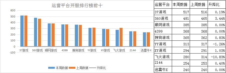 排行榜前十的各大平臺在開服數(shù)量上也基本保持了一個平穩(wěn)的態(tài)勢,漲幅最大的是360游戲,較上周有3.4%的上漲。相比之下,飛火游戲相比上周則大幅下調(diào)了開服數(shù),降幅達(dá)10.83%,這也導(dǎo)致飛火游戲從排行第七下降至第八,而保持穩(wěn)定的XY游戲則以1.03%開服數(shù)上漲頂替飛火游戲來到第七的位置,等于他們換了個位置重新站定。