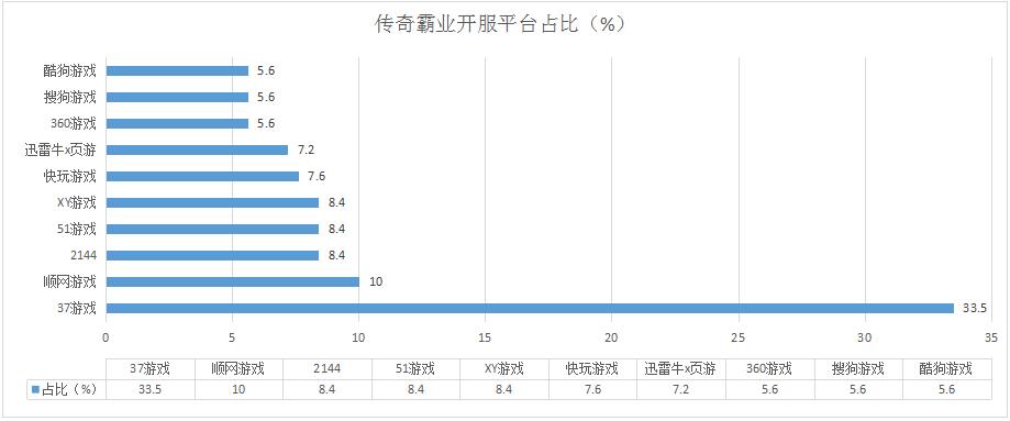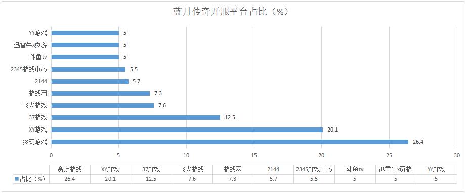 本周《藍(lán)月傳奇》開服總數(shù)較上周有所增長,各平臺開服占比變化不大,新增分布占比平臺YY游戲、迅雷牛X頁游,開服占比均為5%。