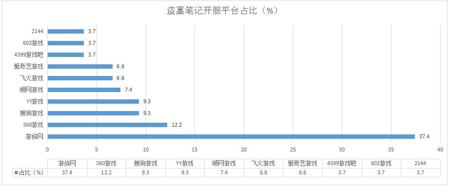 《盜墓筆記》本周開服總數(shù)同樣有所增長,其在游族網(wǎng)的開服占比再次上升到37.4%,而在360游戲的開服占比有所下降。