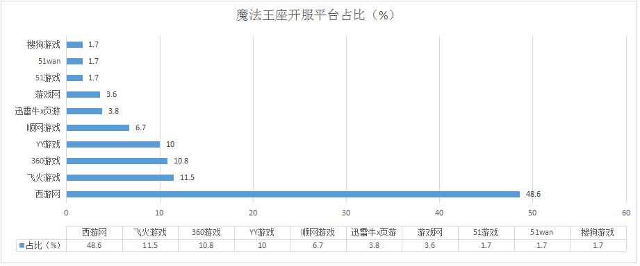本周《魔法王座》開服總數(shù)繼續(xù)保持著穩(wěn)步發(fā)展的態(tài)勢,其在西游網(wǎng)的開服占比再次上升到48.6%,而在飛火游戲的開服占比有所下跌;未有新增分布占比平臺。