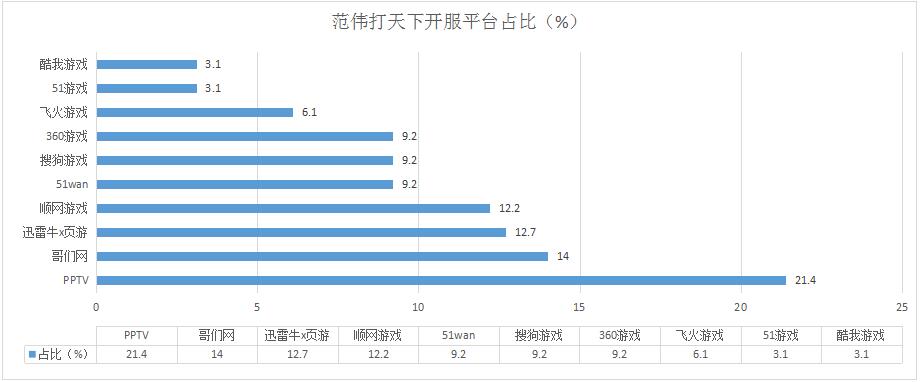 本周《范偉打天下》開服總數(shù)有所下跌,其在迅雷牛X頁游的開服占比有所下調(diào),而PPTV和哥們網(wǎng)的開服占比則有所回升;新增分布占比平臺酷我游戲。