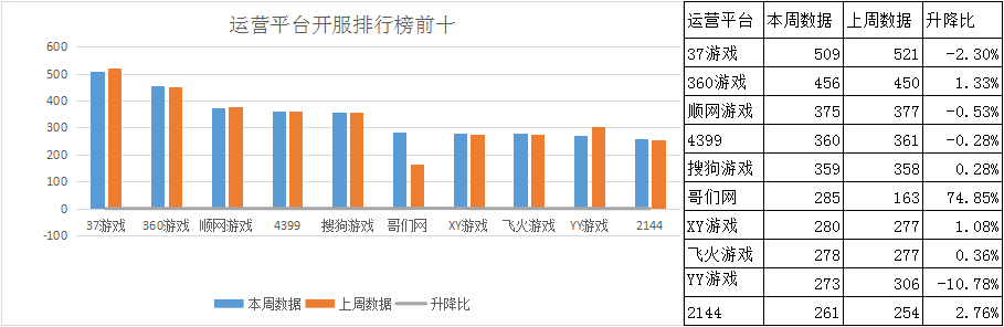 本周運(yùn)營(yíng)平臺(tái)開(kāi)服排行前十的平臺(tái)為37游戲、360游戲、順網(wǎng)游戲、4399、搜狗游戲、哥們網(wǎng)、XY游戲、飛火游戲、YY游戲、2144。榜單平臺(tái)中西游網(wǎng)跌出榜單前十位置,哥們網(wǎng)進(jìn)入榜單,在第七的位置站定。榜單平臺(tái)開(kāi)服情況則相對(duì)比較平穩(wěn),本周榜單平臺(tái)共計(jì)開(kāi)服3436,占一線平臺(tái)開(kāi)服總數(shù)的56.9%。其中排行前三的平臺(tái)開(kāi)服數(shù)為1340組,占榜單平臺(tái)開(kāi)服總數(shù)的39%。