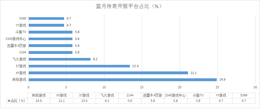 本周《藍(lán)月傳奇》開(kāi)服趨勢(shì)穩(wěn)定,其在各平臺(tái)開(kāi)服占比未發(fā)生太大變化。新增分布占比平臺(tái)5399。