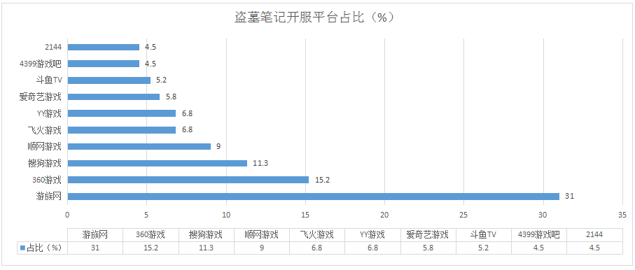 本周《盜墓筆記》開(kāi)服總量略有減少,但總體開(kāi)服仍保持穩(wěn)定。其在游族網(wǎng)開(kāi)服占比達(dá)31%,仍占較大占比。新增分布占比平臺(tái)斗魚(yú)TV,日均開(kāi)服頻率為2服/天。