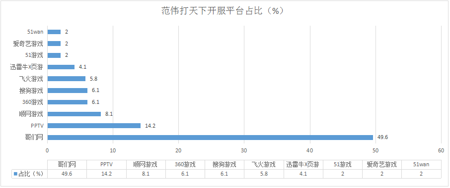 《范偉打天下》本周開(kāi)服呈上漲趨勢(shì),其主要影響來(lái)源于哥們網(wǎng)上調(diào)了開(kāi)服頻率,其在哥們網(wǎng)開(kāi)服占比相應(yīng)增加至45.8%,未有新增分布占比平臺(tái)。