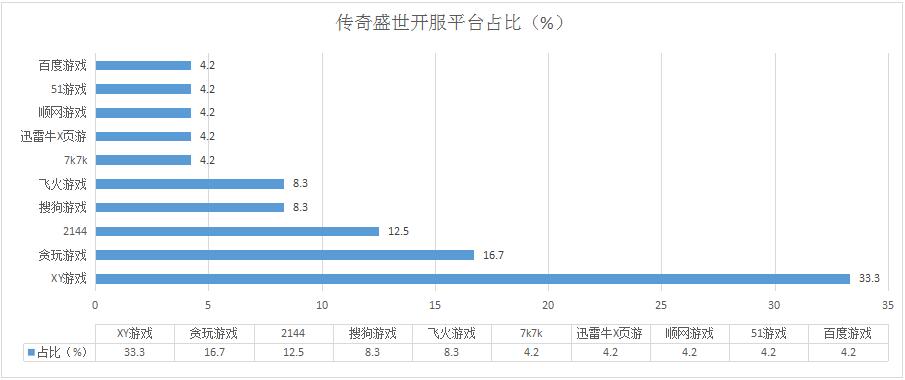 本周《傳奇盛世》繼續(xù)保持著穩(wěn)定的開服態(tài)勢(shì),其在XY游戲的開服占比依舊高達(dá)33.3%,同時(shí)在PPTV、愛奇藝游戲等多個(gè)平臺(tái)的開服占比保持在4.2%。