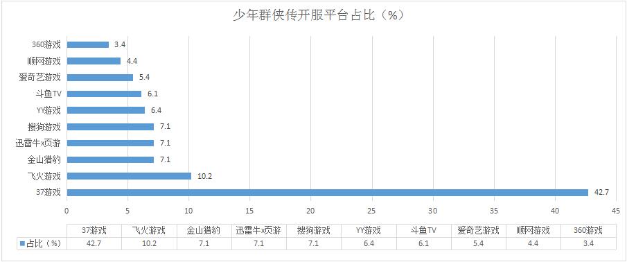 《少年群俠傳》本周開(kāi)服數(shù)較上周略有增漲,其在37游戲的開(kāi)服占比高達(dá)42.7%;新增分布占比平臺(tái)360游戲。
