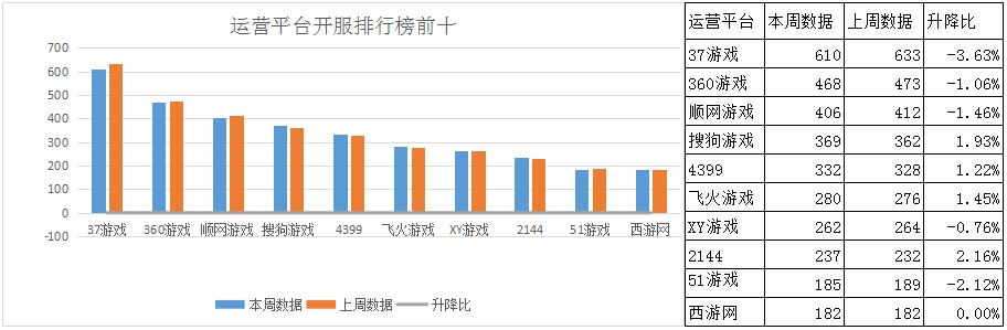 本周各平臺(tái)主打游戲分布占比情況較上周并無(wú)太大變化,其中37游戲《少年群俠傳》本周開服數(shù)略有減少,日均開服頻率由原來(lái)的18服/天調(diào)整為15服/天,開服占比17.2%;此外51游戲《完美紅顏》新晉為主打游戲,開服占比7.6%。