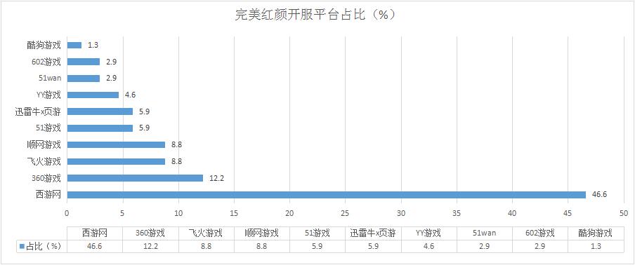 本周《完美紅顏》繼續(xù)保持穩(wěn)定的開服趨勢(shì),西游網(wǎng)開服占比為46.6%,仍接近半數(shù),其他平臺(tái)開服占比基本未發(fā)生變化。