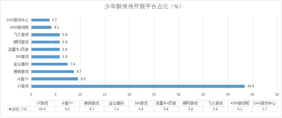 本周《少年群俠傳》開服總數(shù)較上周略有減少,37游戲下調(diào)其開服頻率為主要影響因素,新增分布占比平臺(tái)2345游戲中心。
