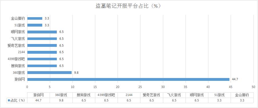 《盜墓筆記》本周開服穩(wěn)定,各平臺(tái)開服占比基本未發(fā)生改變。新增分布占比平臺(tái)金山獵豹,開服頻率1服/天。