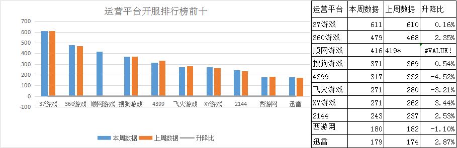 本周開服榜單中,占據(jù)前三位的依舊是37游戲、360游戲和順網(wǎng)游戲老三家。51游戲縮減了開服數(shù)量,調(diào)出了榜單,迅雷牛x頁(yè)游重回榜單,位列第十。西游網(wǎng)雖然也減少了開服數(shù),但減少的不多,在本周不降反升,順勢(shì)來到第9的位置。榜單一線平臺(tái)共計(jì)開服3338組,占一線平臺(tái)開服總數(shù)的57.4%,相較上周上漲了0.5個(gè)百分點(diǎn)。其中前三平臺(tái)開服1506組,相較上周增加22組,占比45.1%。