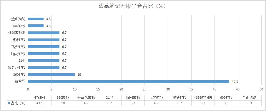 《盜墓筆記》本周開服總數(shù)同樣有所下降,其在游族網(wǎng)的開服占比被進(jìn)一步稀釋至43.1%,開服頻率降為13服/天;其在多個(gè)平臺(tái)的分布占比達(dá)到了6.7%;新增分布占比平臺(tái)602游戲。