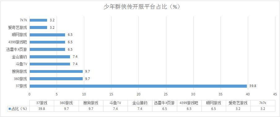 《少年群俠傳》本周開(kāi)服略有下降,37游戲減少其開(kāi)服頻率為主要影響因素,其在37游戲開(kāi)服占比下降至39.8%,較上周減少3.2%。新增分布占比平臺(tái)愛(ài)奇藝游戲、7K7K,開(kāi)服頻率均為1服/天。