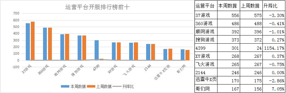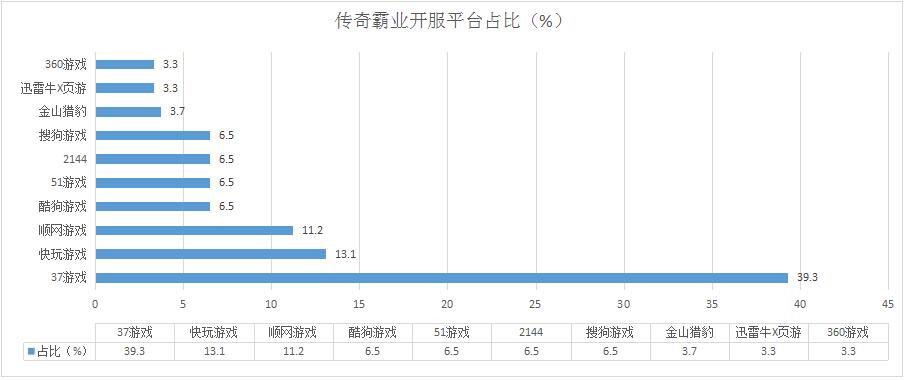 本周《傳奇霸業(yè)》開服數(shù)略有下降,但整體開服形勢穩(wěn)定,其在37游戲的開服頻率依舊高達(dá)12服/天;新增分布占比平臺360游戲。
