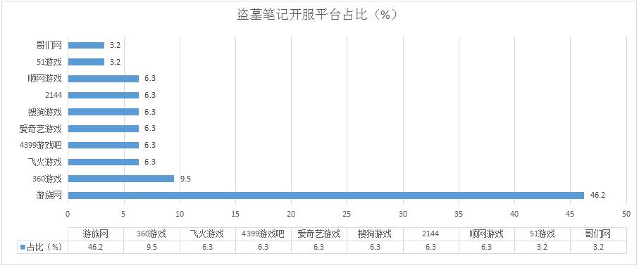 本周《盜墓筆記》開服數(shù)與上周基本持平,其在游族網(wǎng)的開服占比仍接近半數(shù),開服頻率為14服/天;其在多個(gè)平臺的開服占比為3.2%。