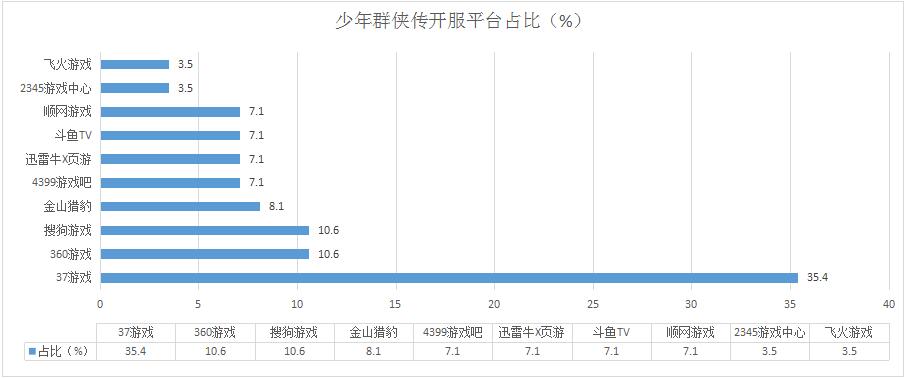 《少年群俠傳》本周開服數(shù)下降了6.3%,其在37游戲的開服占比被進(jìn)一步稀釋至35.4%;新增分布占比平臺2345游戲中心、飛火游戲。