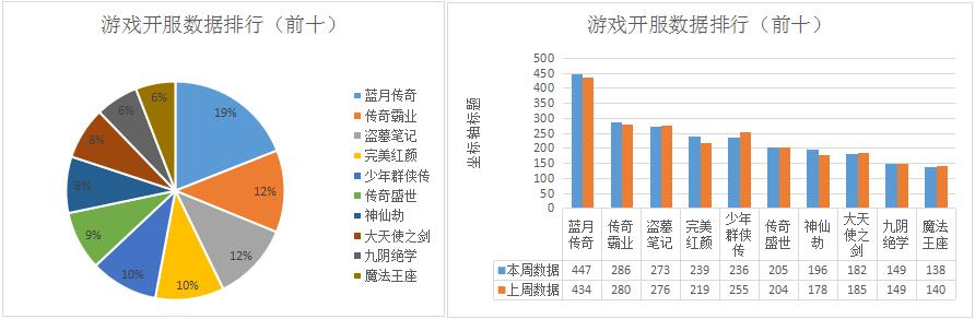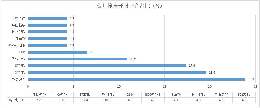 本周《藍(lán)月傳奇》開服繼續(xù)保持小幅增漲,其在貪玩游戲開服頻率上調(diào)為11服/天是其增漲的主要影響因素,其他平臺開服占比基本未變。新增分布占比平臺順網(wǎng)游戲,開服頻率2服/天。