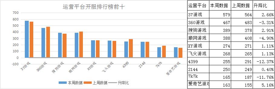 本周就開服數(shù)據(jù)榜單來說,終于算是打破了往日的平靜。長期霸占前三的37游戲、360游戲、順網(wǎng)游戲三家平臺終于換了新面孔。順網(wǎng)游戲相較上周減少開服20組,下降幅度達4.9%;而原本排第4的搜狗游戲增增加了11組開服,順利擠掉順網(wǎng)游戲,進入前三。37游戲增開服務(wù)器15組,360則減少了15組,二家平臺排名未有變化。前三平臺開服共計1435組,占榜單開服總數(shù)的44.9%,相較上周上升0.5%。