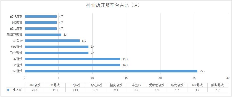 《神仙劫》本周開服總數(shù)較上周增漲了9.7%,其在360游戲的開服占比高達25.5%,同時在酷我游戲、602游戲、酷狗游戲等多個平臺的開服頻率為1服/天。
