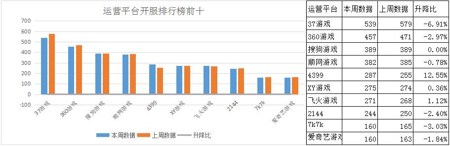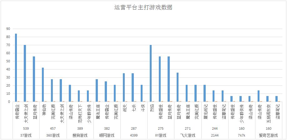 本周各平臺(tái)主打游戲開(kāi)服占比情況與上周相比有所變化,37游戲《藍(lán)月傳奇》上升為平臺(tái)聯(lián)運(yùn)主打產(chǎn)品,開(kāi)服占比為9.7%,開(kāi)服頻率為8服/天;360游戲?qū)ⅰ渡裣山佟吠茷槠脚_(tái)第一主打游戲,開(kāi)服占比達(dá)到了8.1%;而搜狗游戲選擇了《梁山傳奇》作為第一主打產(chǎn)品,日開(kāi)服頻率為3服/天。