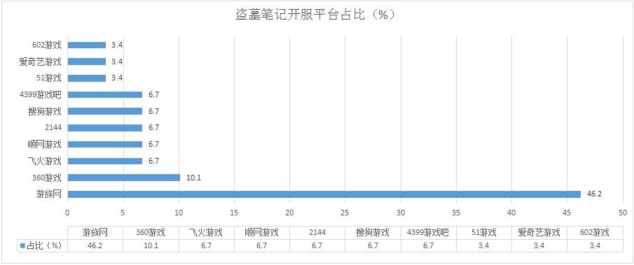 本周《盜墓筆記》開(kāi)服總數(shù)同樣有所下跌,其在愛(ài)奇藝游戲的開(kāi)服頻率有所下降,在51游戲、602游戲等多個(gè)平臺(tái)的開(kāi)服占比為3.3%。